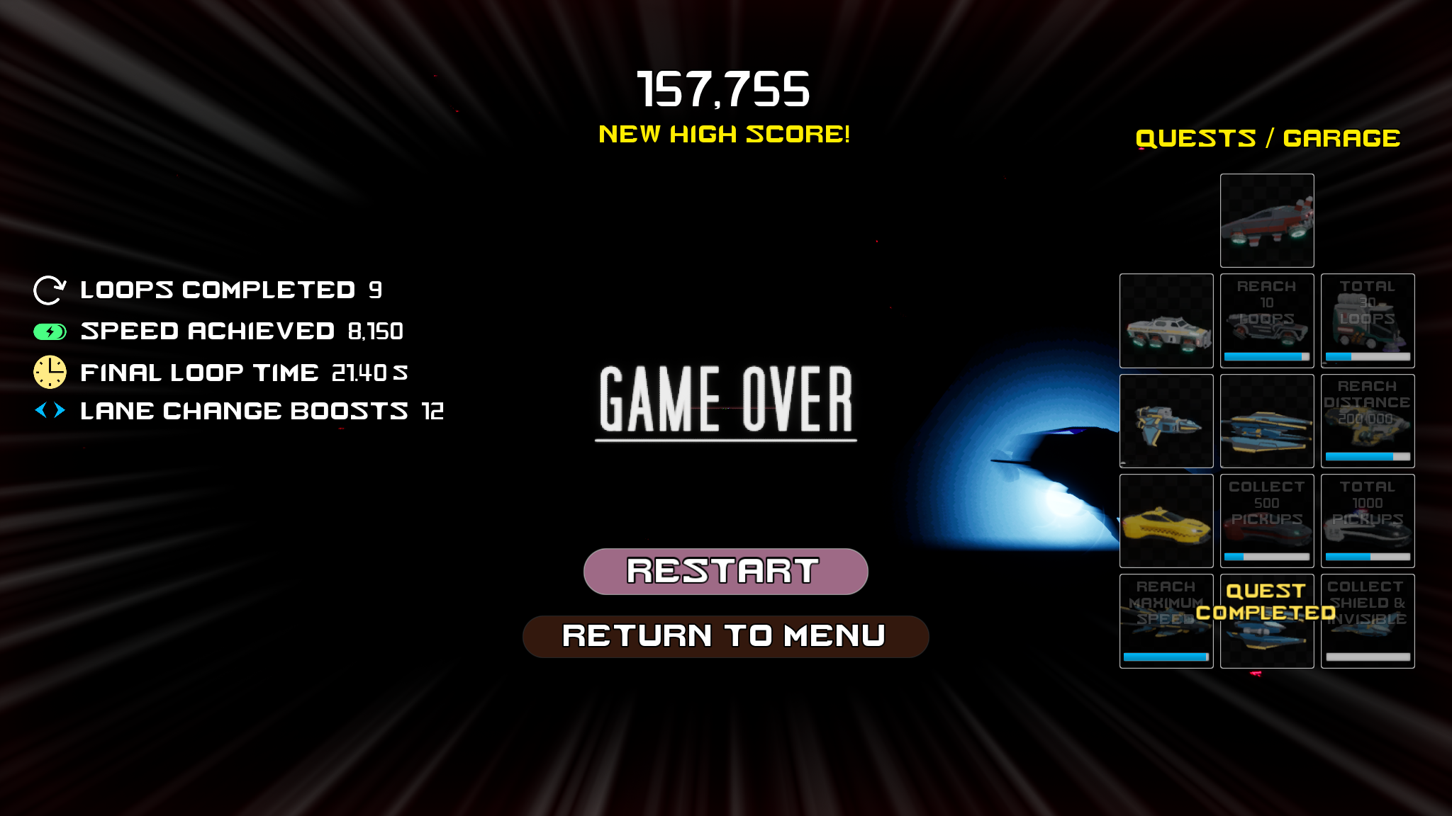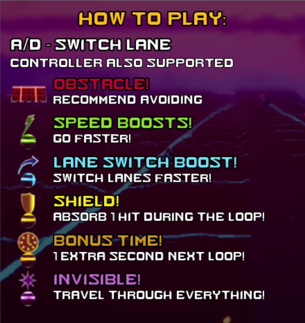 Every 10 seconds the loop resets but every loop you gain a second and you increase your speed! How far can you make it?